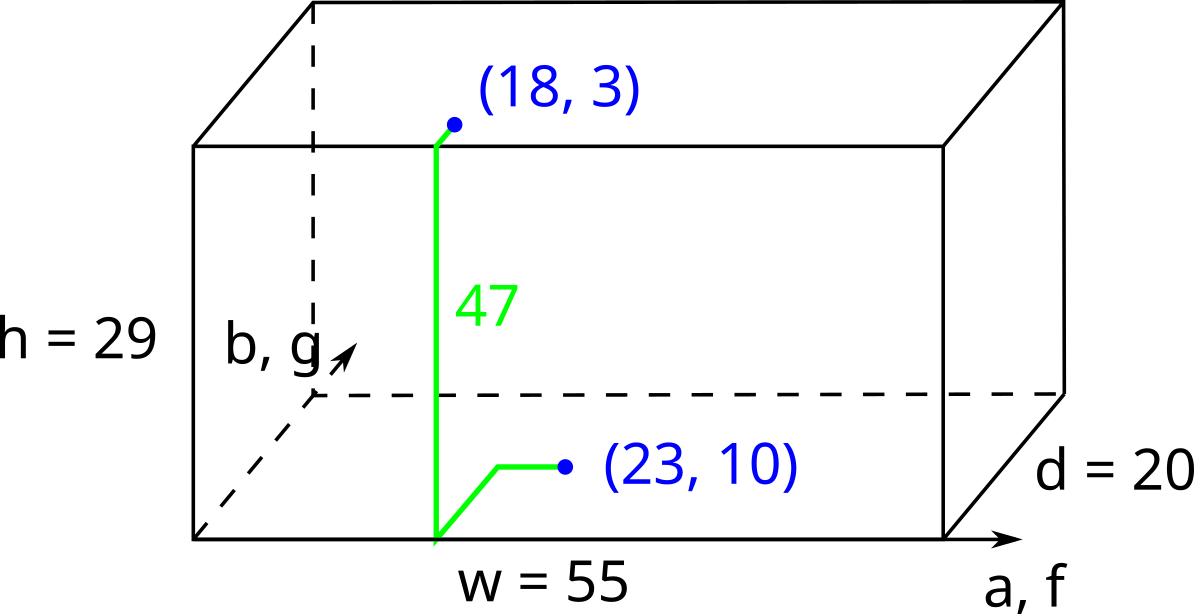 Ноутбук стоит на полу в точке \((a, b)\). Проектор висит на потолке прямо над точкой \((f, g)\). Вика хочет соединить ноутбук и проектор кабелем таким образом, чтобы кабель все время шел вдоль стен, потолка или пола (то есть не висел внутри комнаты). Кроме того, кабель должен всегда идти параллельно одной из сторон параллелепипеда (то есть он не может идти по диагонали).