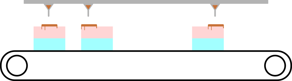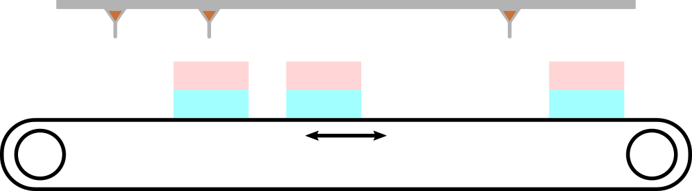Торты и дозаторы, соответствующие первому примеру. Настройку этой части конвейера еще не проводили, поэтому ее нужно выполнить вам. Определите, можно ли подвинуть конвейер так, чтобы крем попал на каждый торт, и при этом не вытек за пределы тортов? Можете считать, что конвейер достаточно длинный, и торты с него никогда не падают. Также учтите, что кнопку можно нажать лишь один раз.