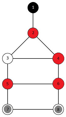 Финиш обозначен чёрным цветом, бонусы красным, фишки — серым. Например, для данного графа можно дойти до финиша фишкой из