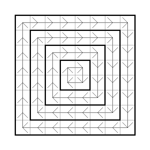 Иными словами, конвейерная матрица для \(n = 2\) — это просто матрица \(2 \times 2\), ячейки которой образуют цикл длины \(4\) по часовой стрелке. Для любого натурального \(k \ge 2\), матрица \(m_{2k}\) получается добавлением к матрице \(m_{2k - 2}\) внешнего слоя, образующего цикл, направленный по часовой стрелке.