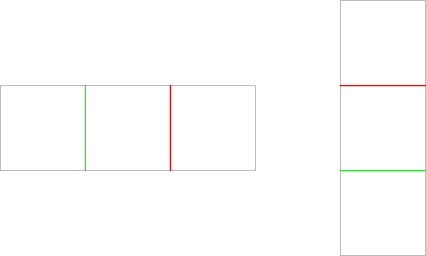 Во втором наборе входных данных у Мясника мог быть либо прямоугольник размером \(1 \times 3\), либо \(3 \times 1\). Разрезы выглядели бы так (сначала был сделан зеленый разрез, затем красный):