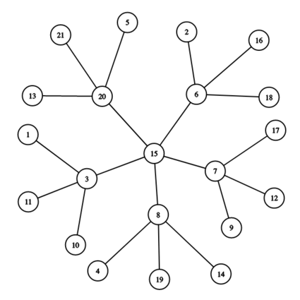 Граф-снежинка выше имеет центральную вершину \(15\), затем \(x=5\) вершин, подключенных к ней (\(3\), \(6\), \(7\), \(8\) и \(20\)), а затем \(y=3\) вершины, подключенные к каждой из них.