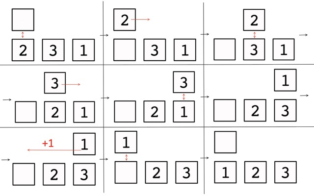 Машинка состоит из \(n\) ячеек, пронумерованных слева направо от \(1\) до \(n\), и движущейся над ними каретки. В ячейках печатной машинки лежат \(n\) различных целых чисел от \(1\) до \(n\), причем в каждой ячейке \(i\) изначально лежит число \(p_i\). До всех действий каретка находится на ячейке с номером \(1\) и в ее буферном хранилище ничего нет. Назовем ячейку текущей, если каретка стоит на этой ячейке.