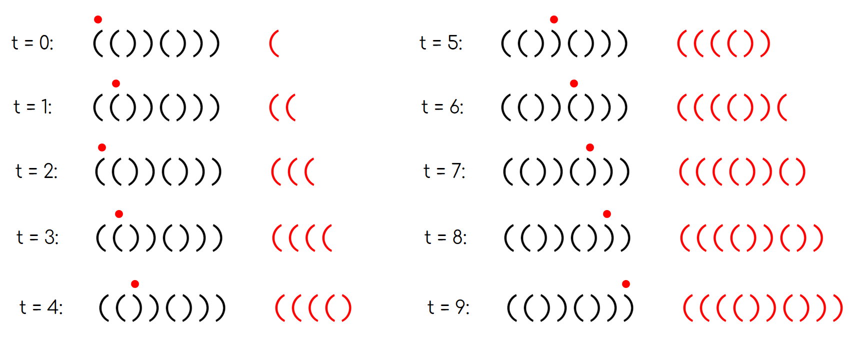 Один возможный корректный путь по \(s=\mathtt{(())()))}\). Красная точка указывает на ваше текущее положение, а красная строка — на записанную вами строку. Обратите внимание, что итоговая красная строка — это правильная скобочная последовательность. Вам даны \(q\) запросов. Каждый запрос меняет значение символа с '(' на ')' или наоборот. После каждого изменения определите, является ли данная строка проходимой.