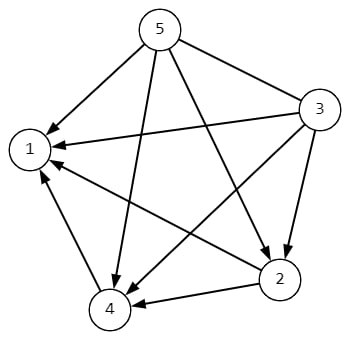 Граф имеет две сильные вершины с номерами в \(3\) и \(5\). Обратите внимание, что между вершинами \(3\) и \(5\) проведено двунаправленное ребро. В третьем примере вершины соединяет единственное направленное ребро от вершины \(2\) к вершине \(1\), поэтому единственная сильная вершина это \(2\).