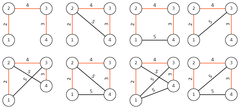 Ниже изображены все возможные графы для второго примера, красным цветом выделено минимальное остовное дерево: