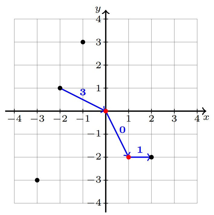 Крупные города отмечены красным. Оптимальный способ выбора перелётов: \(3\rightarrow 1 \rightarrow 2 \rightarrow 5\), что будет стоить \(3+0+1=4\). Обратите внимание, что перелёт \(1\rightarrow 2\) стоит \(0\), потому что города \(1\) и \(2\) являются крупными городами.