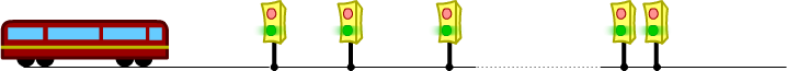 Все светофоры синхронизированы, то есть во все моменты времени показывают одинаковый свет. Иными словами, период красного (и зеленого) цвета одинаковый для всех светофоров, и все они начинают гореть зеленым в нулевой момент времени.