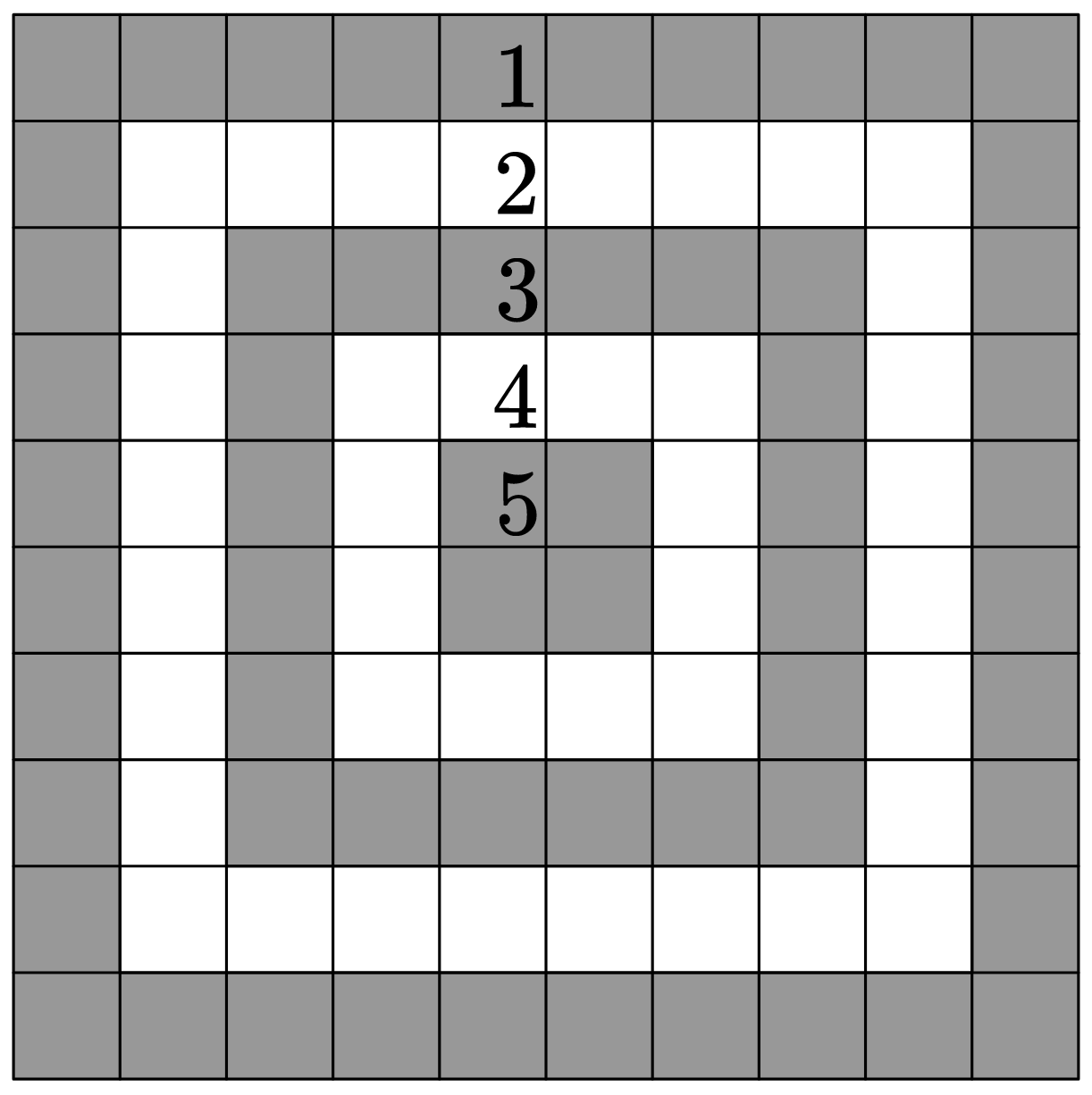 Мишень размером \(10 \times 10\) состоит из пяти «колец», как показано на рисунке. Попадание в каждое кольцо даёт разное количество очков: внешнее кольцо — 1 очко, следующее кольцо — 2 очка, ..., центральное кольцо — 5 очков.