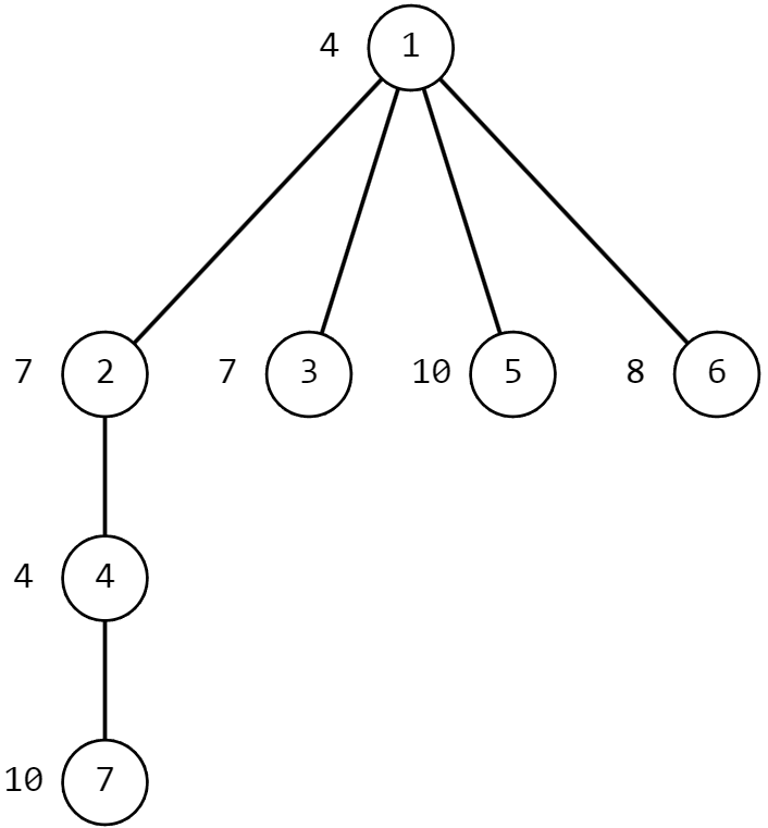 Давайте вычислим красоту вершины \(7\) на этом пути. У нас есть \(g(7,7)=a_7=10=(1010)_2\) и \(g(5,7)=a_5 \ | \ a_1 \ | \ a_2 \ | \ a_4 \ | \ a_7=10 \ | \ 4 \ | \ 7 \ | \ 4 \ | \ 10=15=(1111)_2\), поэтому ее красота равна \(2 + 4 = 6\).