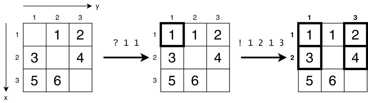 После всех ходов (не обязательно делать все \(10\) ходов и не обязательно делать хотя бы один ход) выведите строку в формате «! \(x_1\) \(x_2\) \(y_1\) \(y_2\)» (\(1 \leq x_1, x_2, y_1, y_2 \leq n, x_1 \ne x_2, y_1 \ne y_2\)). Если клетки \((x_1, y_1)\), \((x_1, y_2)\), \((x_2, y_1)\), \((x_2, y_2)\) раскрашены в различные цвета, то программа жюри выведет «OK». После этого переходите к следующему набору входных данных или завершите программу, если наборов больше не осталось.