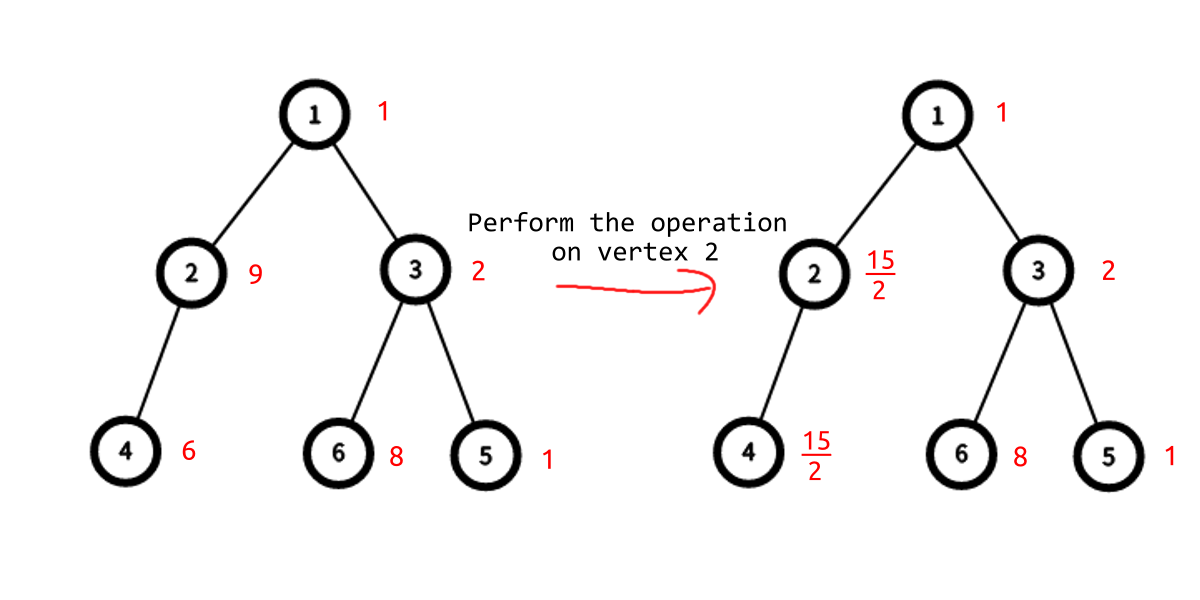 У Дореми есть корневое дерево размера \(n\), корнем которого является вершина \(r\). Изначально на вершине \(i\) записано число \(w_i\). Дореми может использовать свою силу, чтобы выполнить данную операцию не более \(k\) раз:
