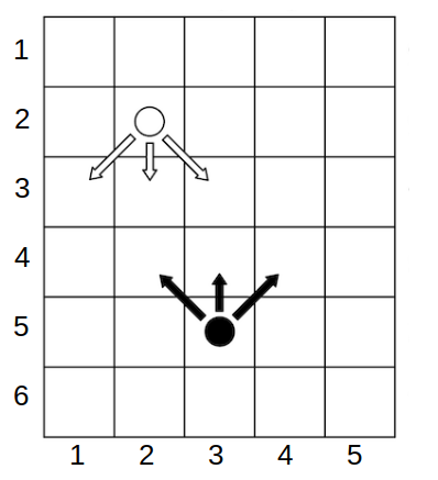 Пример состояния игры. Алиса играет белой фишкой, Боб — черной. Стрелками обозначены возможные ходы. Игрок немедленно побеждает, если ставит свою фишку в клетку, занятую фишкой другого игрока. Если какой-либо из игроков не может сделать ход (Алиса — если находится в последней строке, т. е. \(x_a = h\), Боб — если в первой, т. е. \(x_b = 1\)), игра сразу же завершается ничьей.