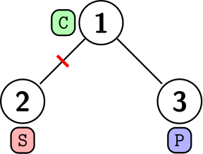 В первом случае мы можем установить одну толстую стену между комнатами \(1\) и \(2\), как показано ниже. Мы не можем установить \(0\) стен, так как тогда музыка из комнаты 3 дойдет до комнаты 2, где студент хочет спать, поэтому ответ равен \(1\). Существуют и другие допустимые решения.