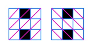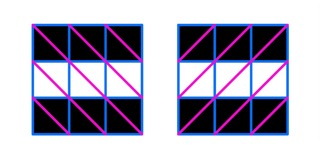 На картинках снизу чёрным цветом отмечены закрашенные клетки, фиолетовым цветом отмечены все диагонали.