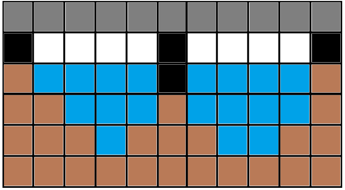 Это не вид сверху, а вид сбоку: серые ячейки — сам мост, белые ячейки — пустые, черные ячейки — опоры, синие ячейки — вода, коричневые ячейки — дно реки. Во втором наборе мост выгоднее всего построить на второй и третьей строках. Опоры будут стоять в клетках \((2, 3)\), \((3, 2)\) и на берегах.