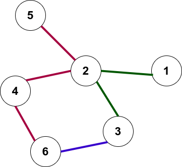Во втором наборе тестовых данных из вершины \(1\) в вершину \(6\) можно добраться по пути \(1 \rightarrow 2 \rightarrow 3 \rightarrow 6\), воспользовавшись зеленой и синей веткой.