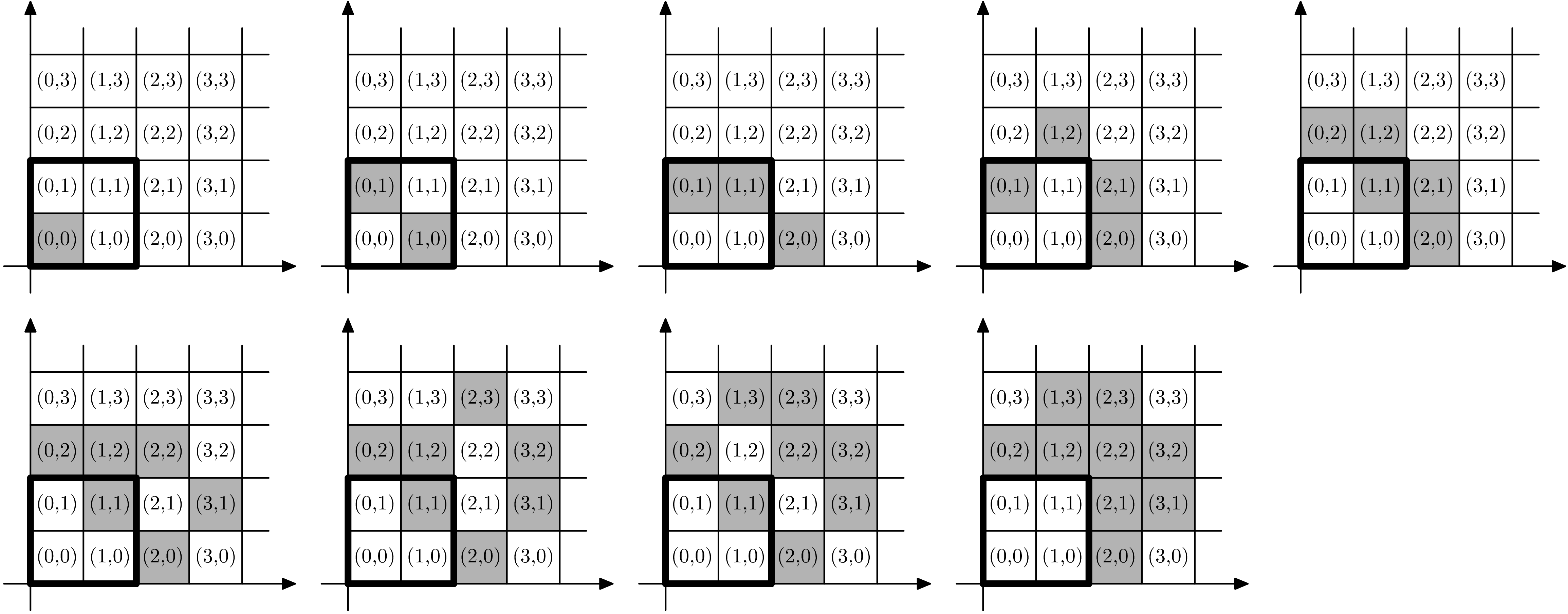 In the first test case, dividing the following cells in the following order creates an organism without any forbidden cells: \((0, 0)\), \((1, 0)\), \((1, 1)\), \((0, 1)\), \((2, 1)\), \((2, 2)\), \((1, 2)\), \((1, 1)\). The following picture demonstrates how the organism changes during this process: