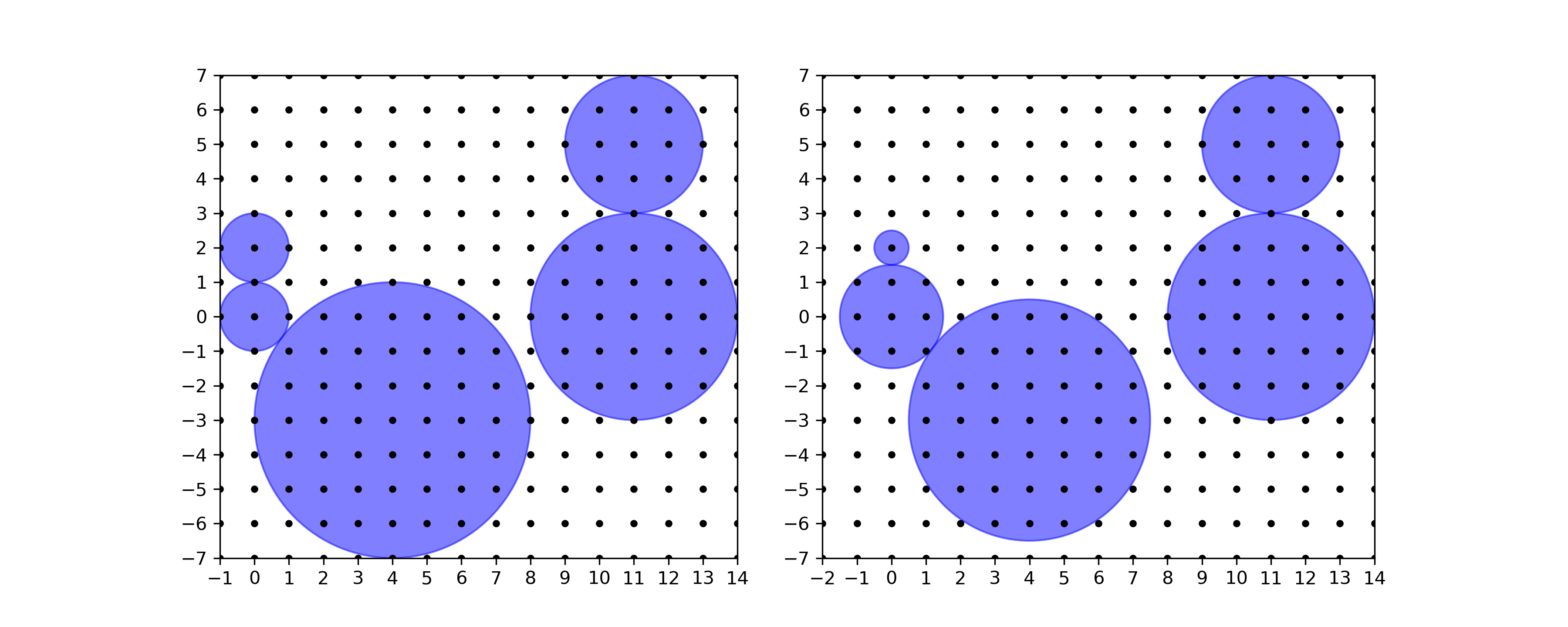 First sample (left) and a valid way to change the radii of the disks (right). In the second sample, depicted below, there is no way to change the radii of the disks in the desired manner.