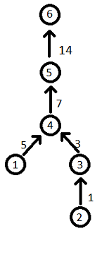 Рассмотрим процесс построения ориентированного взвешенного леса. Изначально лес не содержит вершин. Вершины последовательно добавляются по одной. Всего выполняется n операций добавления. i-я (i > 0) операция добавления описывается набором чисел (k, v1, x1, v2, x2, ... , vk, xk) и означает, что в граф нужно добавить вершину номер i и k ребер: ребро из вершины root(v1) в вершину i весом depth(v1) + x1, ребро из вершины root(v2) в вершину i весом depth(v2) + x2 и так далее. В случае, если k = 0, в граф добавляется только вершина i и не добавляется никаких ребер.