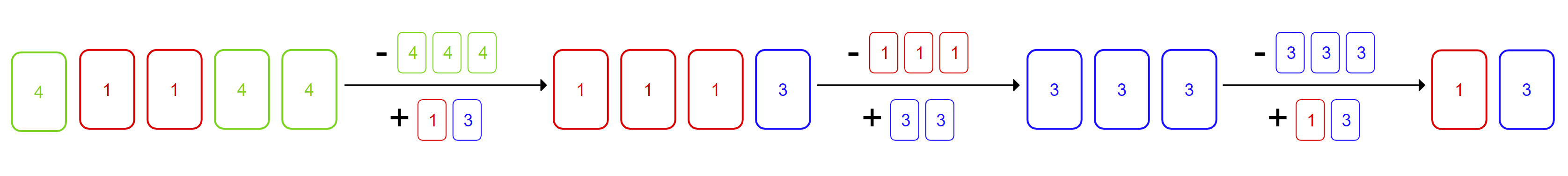 В четвертом примере вы можете многократно выбирать \(4\) карты с номером \(1\) и заменять их на \(3\) карты с номером \(1\), пока не останется \(3\) карты.