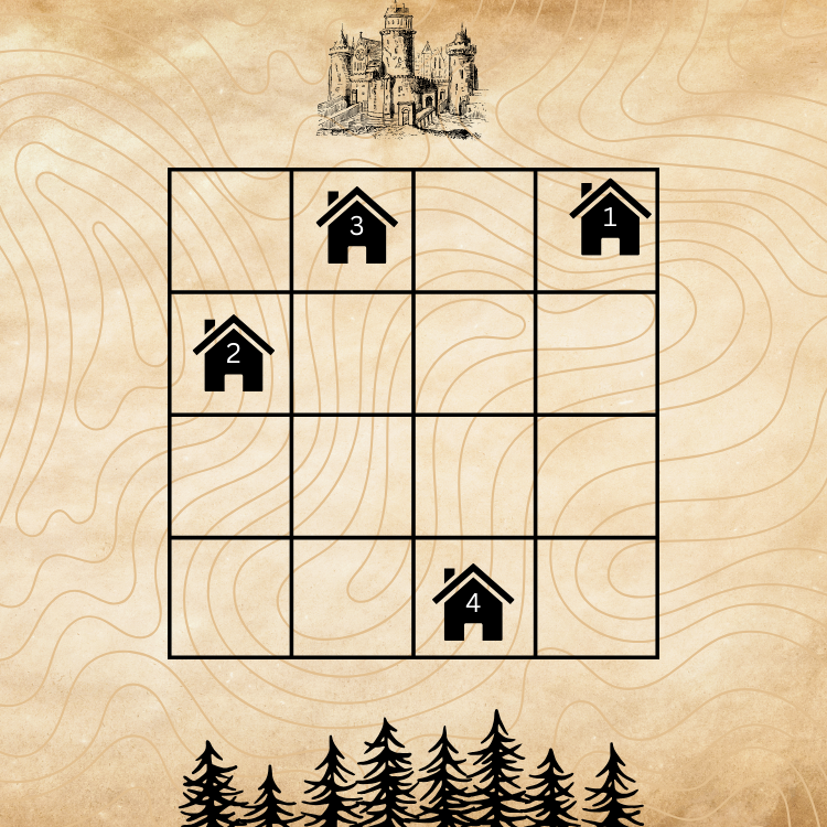 For the sample, the house of the 1st wizard is located at \((4, 4)\), of the 2nd at \((1, 3)\), of the 3rd at \((2, 4)\), of the 4th at \((3, 1)\).