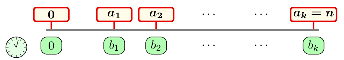 На прямой находится \(k+1\) знак в точках \(0, a_1, a_2, \dots, a_k\), и Тимур знает, что машина прибудет туда в минуты \(0, b_1, b_2, \dots, b_k\) соответственно. Последовательности \(a\) и \(b\) возрастающие, причем \(a_k = n\).