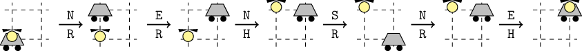Рассмотрим первый пример: строка \(S = \texttt{NENSNE}\). Одно из возможных решений, показанное на рисунке ниже \(p = \texttt{RRHRRH}\), с использованием которого и ровер, и вертолет окажутся на один метр на север и на один метр на восток.