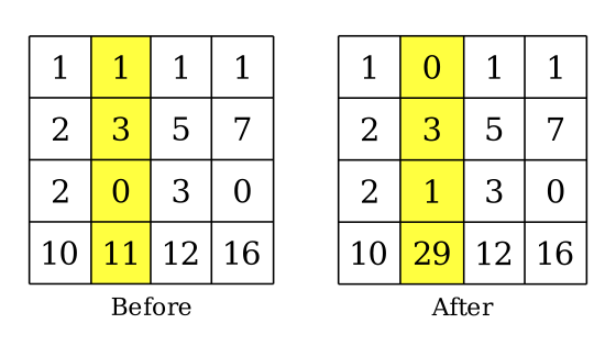 Пример применения операции к столбцу \(2\) матрицы. В этом примере, когда мы применяем операцию к столбцу \(2\), все элементы в этом столбце изменяются следующим образом: