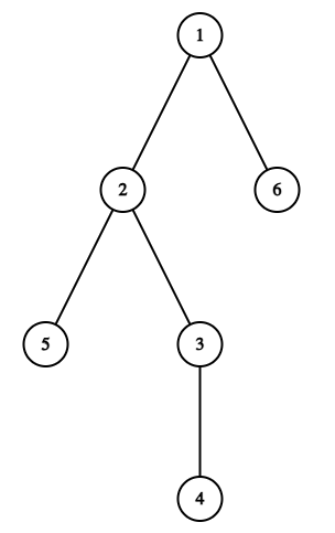 Дерево на этой картинке не удовлетворяет условию, так как в поддереве вершины \(2\) номера вершин \(2\) и \(4\) не являются последовательными целыми числами. Определим \(\operatorname{dist}(u, v)\) как длину простого пути между вершинами \(u\) и \(v\) в дереве.