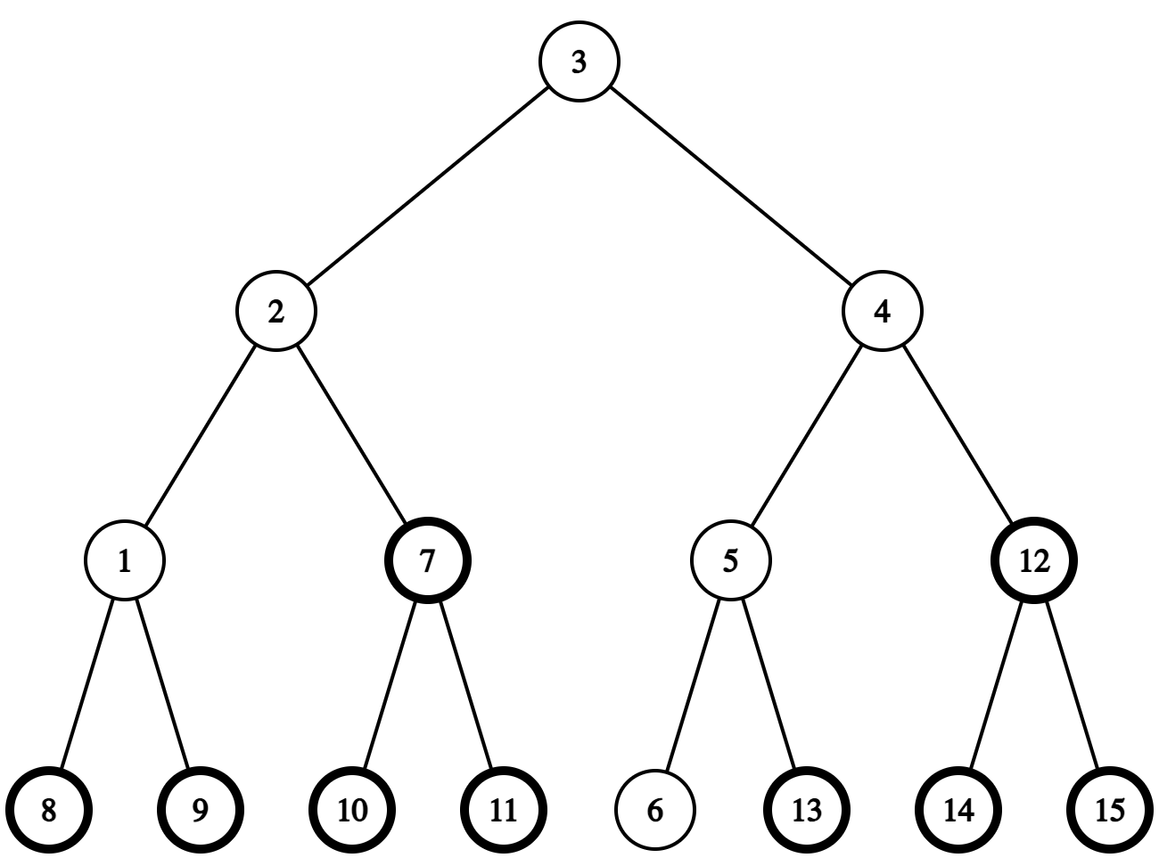 Во втором наборе входных данных полное бинарное дерево, образованное после добавления некоторых вершин к дереву, состоящему из \(n\) вершин, показано ниже (добавленные вершины выделены жирным):
