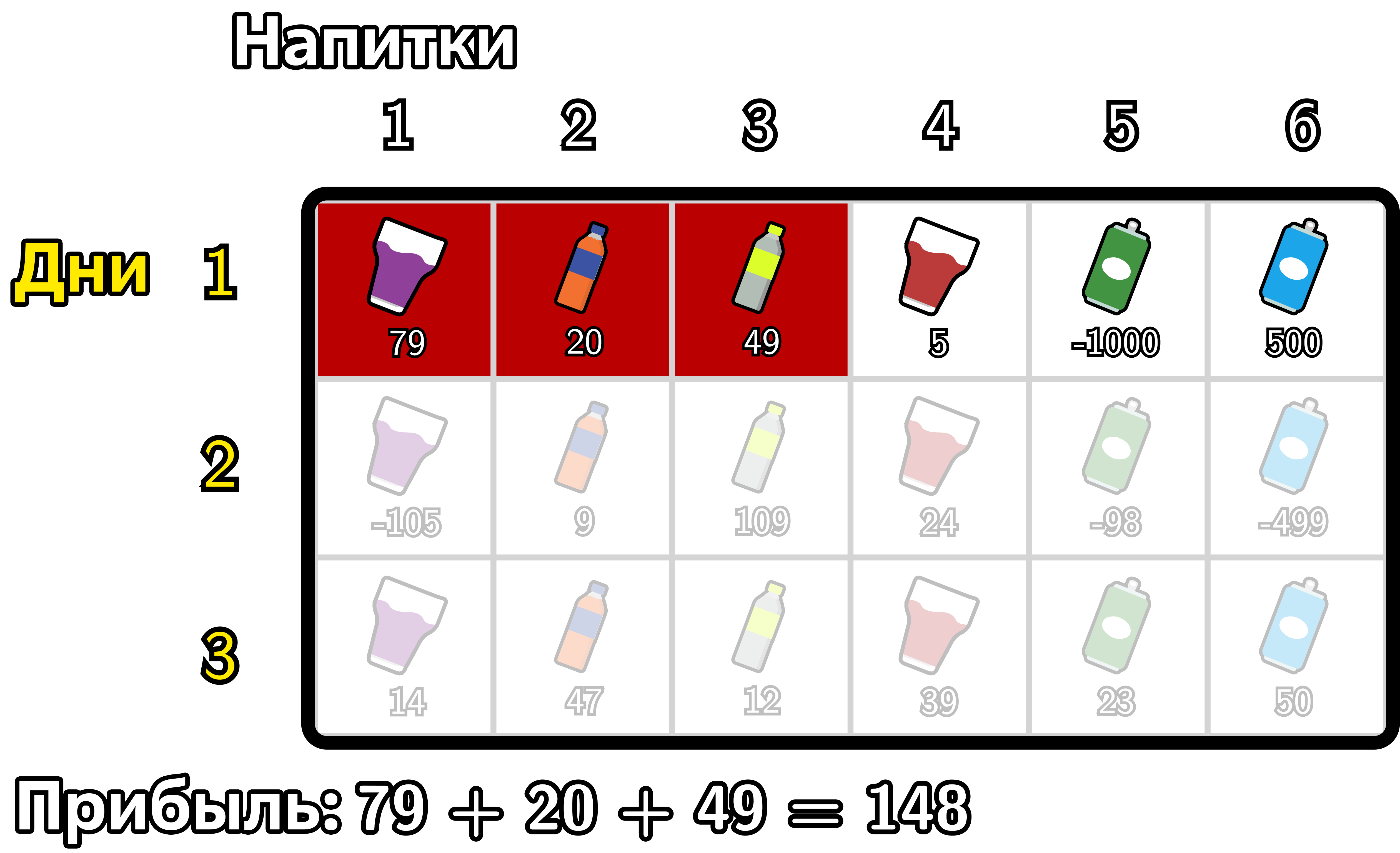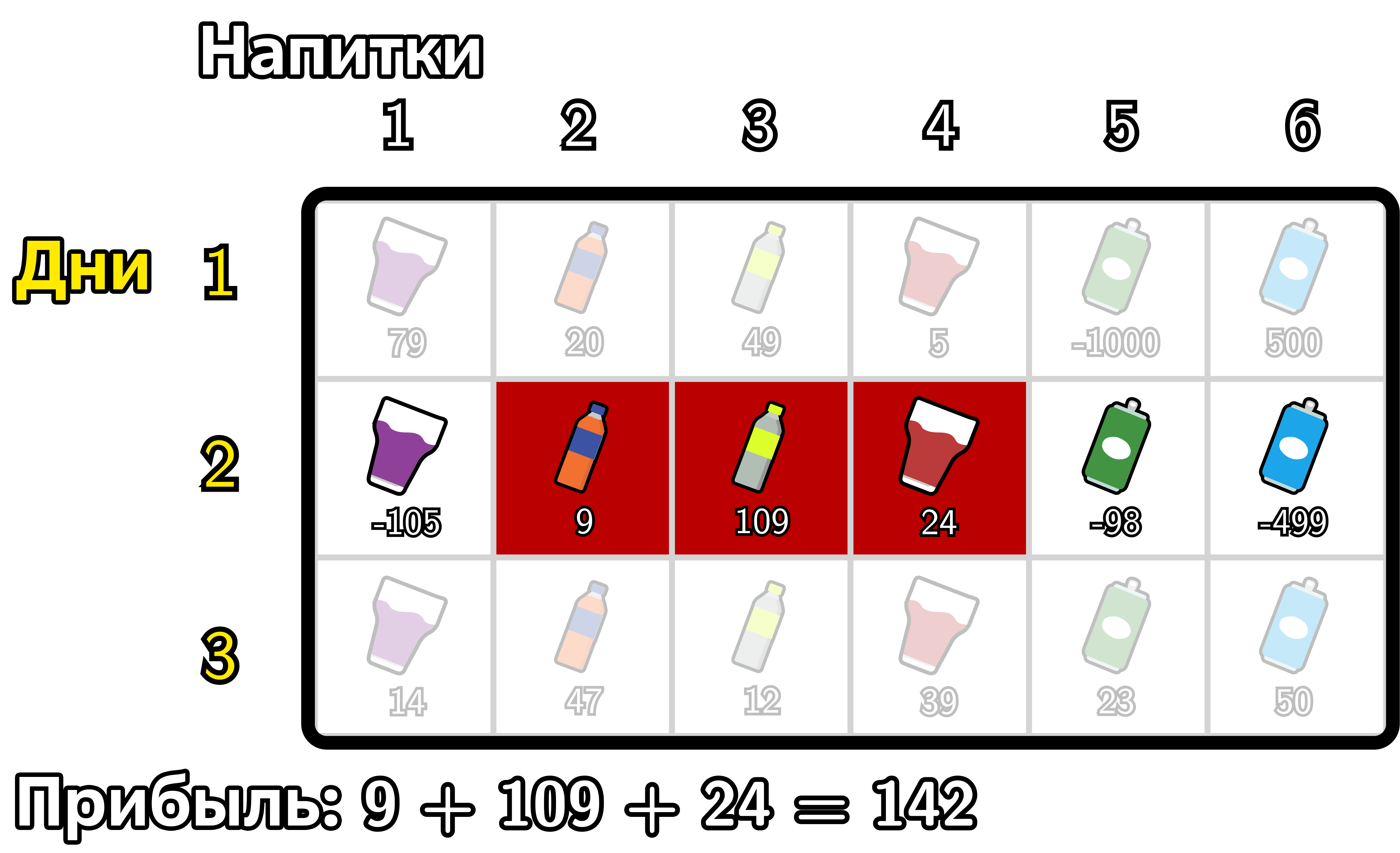 Дневная прибыль — это сумма прибылей от всех типов напитков, проданных в этот день. Общая прибыль по плану продаж — это сумма прибылей за \(n\) дней. Какую максимальную общую прибыль можно получить, если Пак Чанек оптимально спланирует продажи?
