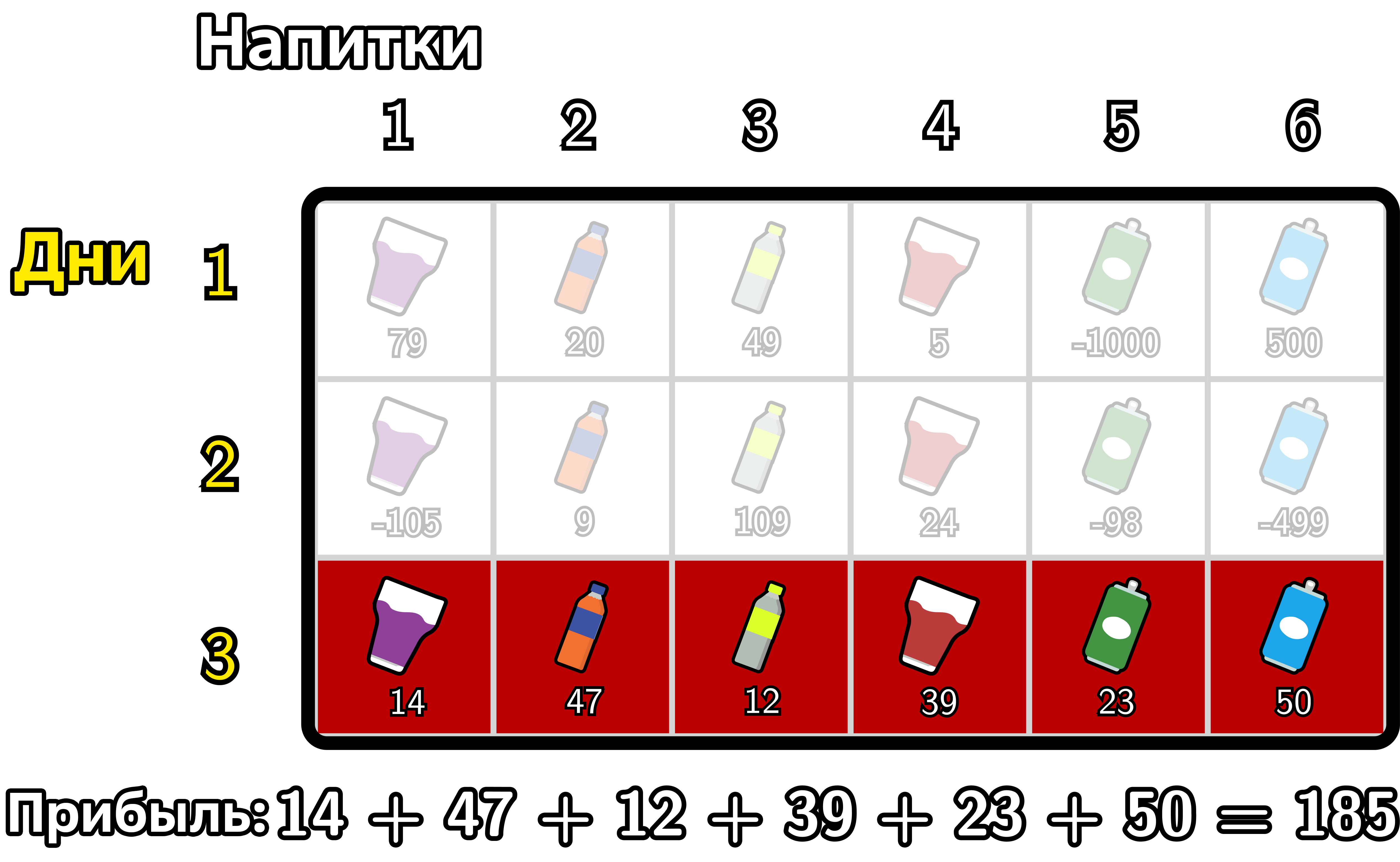 - В день \(3\) Пак Чанек продаст напитки с \(1\) по \(6\). Прибыль составит \(185\).