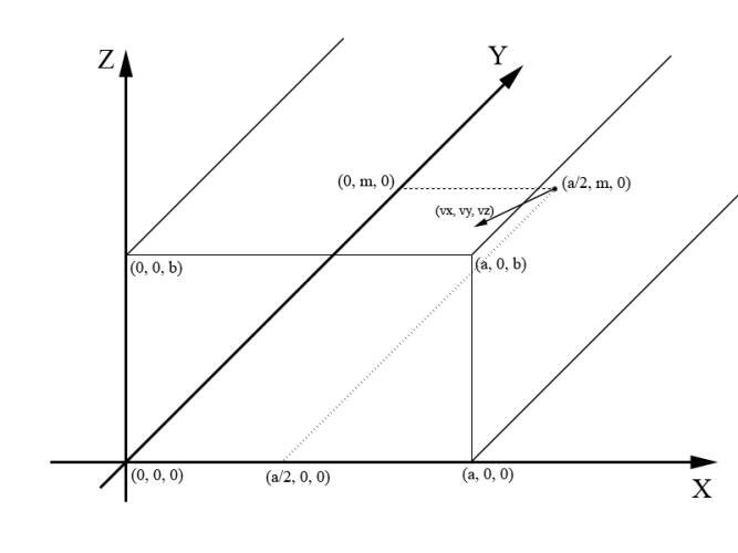 Опишем данное событие более формально. Мяч будем считать точкой в пространстве. Дверь коридора будем считать прямоугольником, расположенным в плоскости xOz таким образом, что левый нижний угол двери расположен в точке (0, 0, 0), а правый верхний — в точке (a, 0, b). Коридор будем считать прямоугольным параллелепипедом, бесконечным в сторону увеличения координаты y. При этом пол коридора будем считать плоскостью xOy, а потолок — плоскостью, параллельной xOy и проходящей через точку (a, 0, b). Будем также считать, что одна из стен — это плоскость yOz, а другая стена — это плоскость, параллельная yOz и проходящая через точку (a, 0, b).