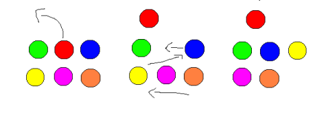 Человек, находящийся на позиции \((r,c)\), решил уйти. Пусть он имел номер \(i\). Чтобы заполнить пробел, каждый человек с номером \(j>i\) переместится на позицию, на которой изначально находился человек с номером \(j-1\). Ниже приведена иллюстрация для случая, когда \(n=2\), \(m=3\), \(r=1\) и \(c=2\):