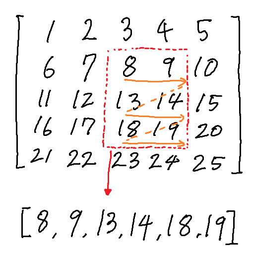 Следующее изображение иллюстрирует разравнивание подматрицы, ограниченной красными пунктирными линиями. Оранжевые стрелки указывают направление, в котором элементы подматрицы добавляются в конец \(A\), а \(A\) показан внизу изображения.