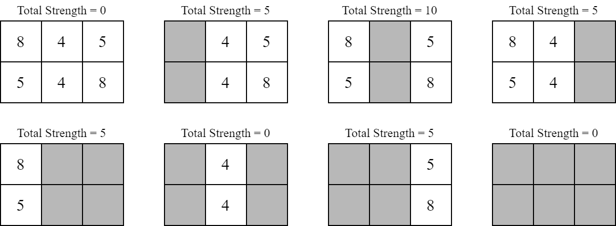 The strength of a connected area \([u, v]\) can be calculated as follows. Let \(m_1\) and \(m_2\) be the maximum power of the soldiers in the first and second rows of the connected area, respectively. Formally, \(m_r = \max (P_{r, u}, P_{r, u + 1}, \dots, P_{r, v})\) for \(r \in \{ 1, 2\}\). If \(m_1 = m_2\), then the strength is \(0\). Otherwise, the strength is \(\min (m_1, m_2)\).