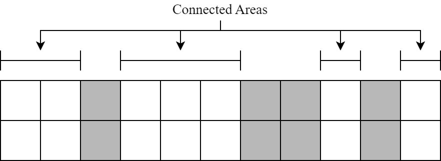 Define a connected area \([u, v]\) (\(u \leq v\)) as a maximal set of consecutive columns from \(u\) to \(v\) (inclusive) such that each column in the set is not covered in fog. The following illustration is an example of connected areas. The grayed cells are cells covered in fog. There are \(4\) connected areas: \([1, 2]\), \([4, 6]\), \([9, 9]\), and \([11, 11]\).
