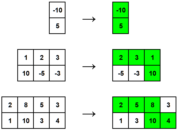 Ниже приведены объяснения первых трех наборов входных данных из примера. Левая матрица — это матрица, заданная во входных данных, правая — состояние матрицы после нескольких (возможно, нуля) перестановок столбцов. Оптимальный путь выделен зеленым цветом.