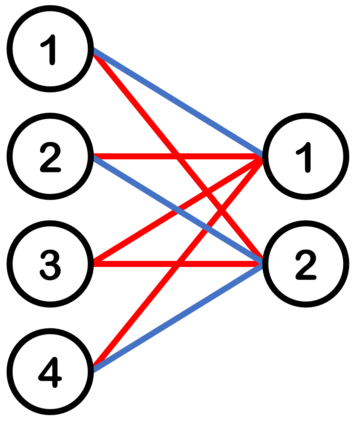 Кевин должен раскрасить каждое ребро в положительное целое число из отрезка \( [1, n] \). Шаблон дизайна постера является хорошим, если в двудольном графе нет одноцветных циклов\(^{\text{∗}}\).
