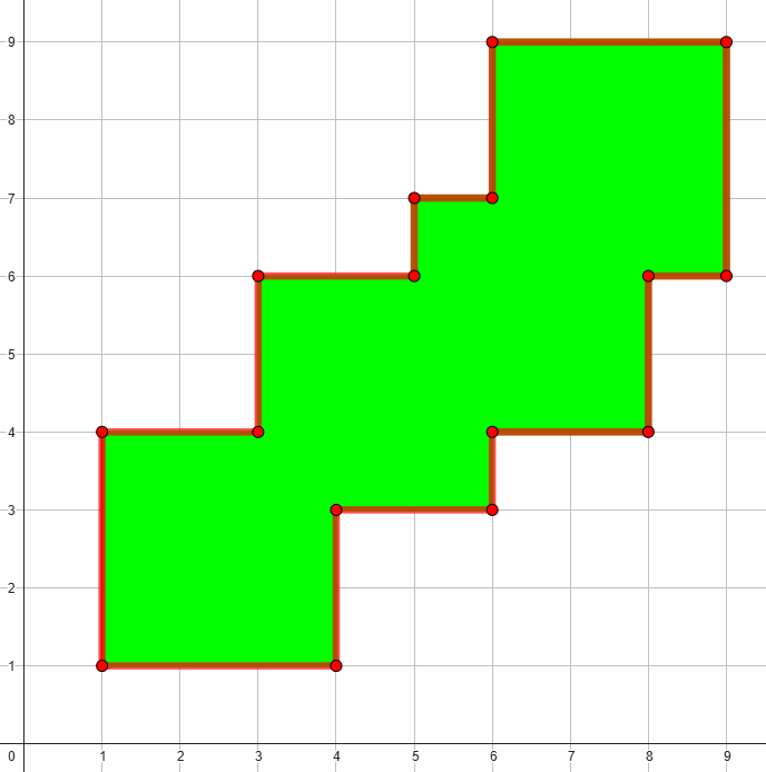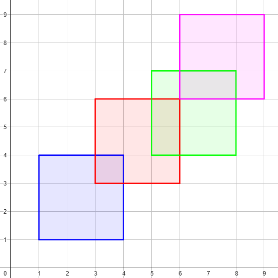 Здесь квадрат, образованный первым нажатием, окрашен в синий цвет, вторым — в красный, третьим — в зеленый, а четвертым — в фиолетовый. Объединённая фигура, периметр которой нам нужно вычислить, выглядит следующим образом: