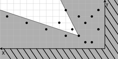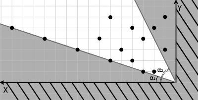 Теперь он выбирает любую из звезд, лежащих строго между этими лучами. После этого он опять проводит лучи, выходящие из этой звезды, под теми же углами α1 и α2 к оси OX и выбирает очередную звезду, лежащую строго между новыми лучами. Так он повторяет до тех пор, пока между лучами, выходящими из очередной звезды, есть еще звезды, которые он может выбрать.