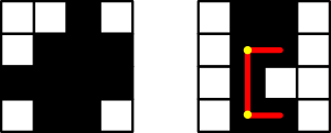 Рассмотрим таблицу размера n × m. Изначально все ячейки таблицы закрашены белым цветом. Ленни закрасил некоторые из ячеек (по красней мере, одну) черным. Назовем таблицу выпуклой, если можно пройти от любой черной ячейки до любой другой черной ячейки (разрешено переходить с ячейки на любую из соседних по стороне черных ячеек), изменяя направление не больше одного раза на протяжении пути. На картинке ниже левая таблица выпуклая, а правая — нет, поскольку существуют две ячейки, путь между которыми в любом случае требует более одного изменения направления движения.