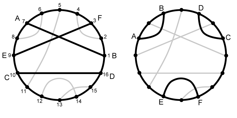 Рисунки ниже показывают две разных схемы, где конечные точки обозначаются точками на окружности. Схема слева не подходит. Несмотря на то, что каждая парочка (A и B, C и D, E и F) соединена линией, нарушено условие расстояния. Расстояние между A и B равняется 2 (можно дойти от A до B через F по часовой стрелке). Расстояние от E до F также равняется 2. Однако расстояние от C до D равняется 1 (можно пройти от C до D против часовой стрелки и не пройти мимо какой-либо другой берлоги). Справа показана верная схема. Все три пары имеют одинаковое расстояние 1.