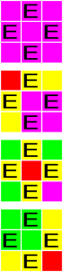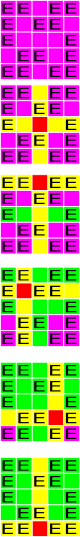 Первый пример иллюстрируется следующим образом. Фиолетовым выделены неочищенные злые плитки. Красным выделена плитка, на которую наложено заклинание очищения. Желтым выделены плитки, на которые распространяется текущее заклинание (возможно, ранее они уже были очищены). Зеленым выделены ранее очищенные плитки.