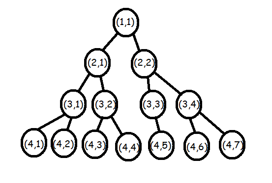 Новое дерево состоит из n уровней, а каждая вершина проиндексирована двумя целыми числами: номером уровня и номером вершины на текущем уровне. Корень дерева находится на уровне 1 и имеет индекс (1, 1). Далее следует псевдокод построения дерева.
