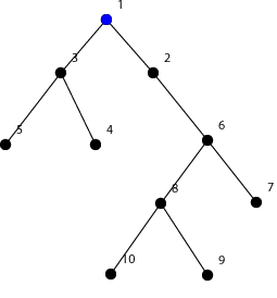 Дерево в первом примере показано на рисунке внизу. Черный, красный и синий цвета соответствуют вершинам с 0, 1, 2 литрами воды.