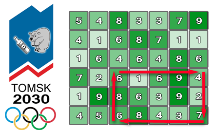 Для более четкого понимания можно рассмотреть первый пример входных данных. В этом примере n = 6, m = 7, а администрация хочет, чтобы время прохождения трассы было как можно ближе к t = 48 секундам, причем tp = 3, tu = 6 и td = 2. Если рассмотреть показанный стрелками на изображении прямоугольник, то при движении по его границе по часовой стрелке у среднестатистического биатлониста уйдет ровно 48 секунд. Левый верхний угол этой трассы расположен в квадрате с номером строки 4 и номером столбца 3, а правый нижний — в квадрате с номером строки 6 и номером столбца 7.