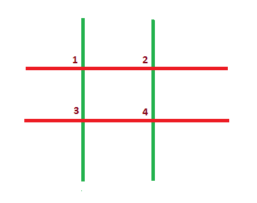 Изначально сетка имеет 4 точки пересечения. На рисунке они пронумерованы от 1 до 4.
