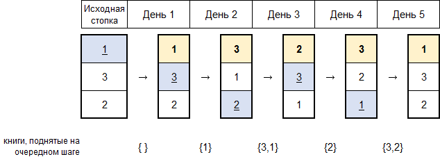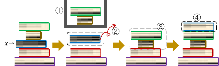 Дом Jaehyun'а слишком маленький для книжного шкафа, поэтому он хранит свои n книг в вертикальной стопке. Когда он хочет прочитать некоторую книгу x, он выполняет следующие шаги: